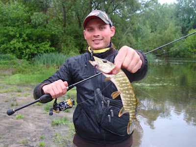 В общем выплыть получилось, не смотря на ранний выезд, только к 10-00. Первым пошел Димка, за ним отец, и я последним. С целью сделать побольше разрыв между лодками, я пошел на веслах вверх по течению. Пока плыл, бросал спиннинг, начал с твичинга и довольно быстро поймал первую щучку грамм на 150 на жакалловского Риренжа 110 в хоторанже, которую отпустил.
