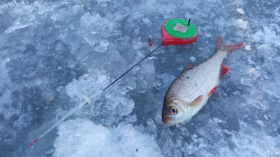 В скором здесь была еще одна полупоклевочка, но увы мимо. Далее я начал ходить по новым соседним лункам и таки ближе к часу дня нашел уловистую луночку, где сразу поймал несколько плотвичек, красноперку, а потом здесь стал попадаться и подлещик, но в основной мелкий с ладошку и даже меньше.